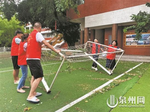 泉州市晋光小学教师扶起倒塌的架子 泉州市晋光小学教师们第一时间赶赴学校,凝心聚力,全力以赴恢复校园秩序。7月29日下午,看到学校内外一片狼藉,建筑物、室内外设施、树木等损毁严重,校领导、党员教师和教师团员志愿者、物业人员共20多人纷纷行动起来,主动承担脏活、累活、重活,他们充分发挥志愿奉献精神,修整走廊楼道,排查各组室班级电源插头、墙面、进水情况等安全隐患,清除损毁枝叶、扶植倒塌树木、清理淤泥、打扫卫生等,对学校进行全覆盖排查,在有风险的墙体、树木下布置警戒线。在大家分工合作、齐心协力、相互配合下,当天下午学校的道路更畅通了,环境更整洁了,满目疮痍的校园也逐渐恢复原来的风貌。 台风过后,丰泽区第二实验小学校园内被吹倒、吹断的树木随处可见,南门的铁门也被狂风暴雨击倒,各种碎片飞落在地。校长赖艳梅第一时间带领总务处、教导处等相关部门负责人及值班教师、保安深入校园,重点巡查校园自然灾害风险点、各教学楼、功能室、校园环境和后勤保障等相关情况,组织维修人员齐力扶起南边大铁门,疏通教学楼天台受堵下水道,清理部分存在隐患的掉落树枝,在危险地带重新设置警戒线,提醒值班人员注意高空坠物,确保在校人员和财产的安全,做好校园的“守护者”。学校各有关部门切实全面、深入、细致地配合做好各项工作,认真排查重点区域安全隐患,加固设施,做好供水供电等后勤保障工作。