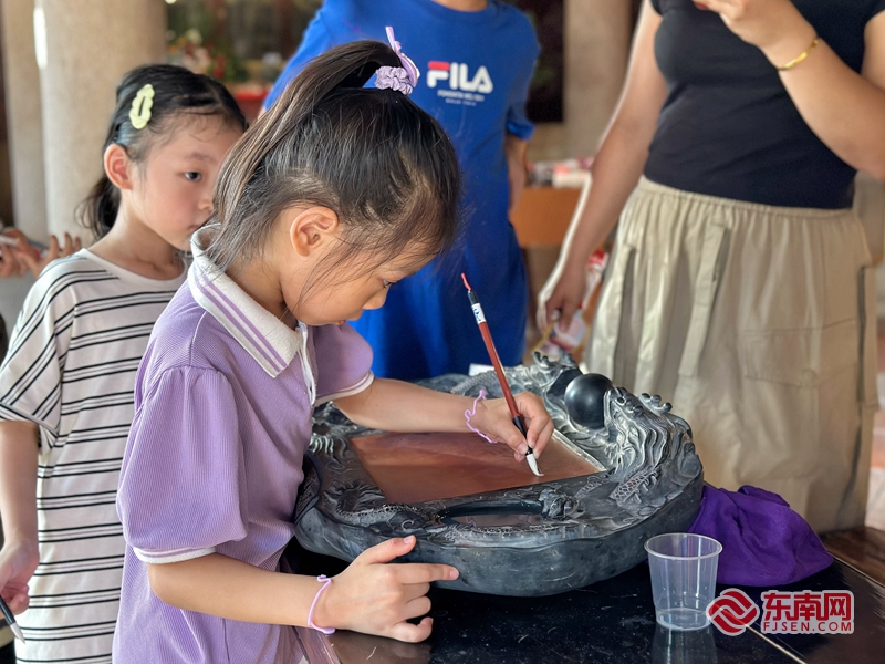 孩子在“开笔石”上“开笔”。东南网记者 林婕 摄