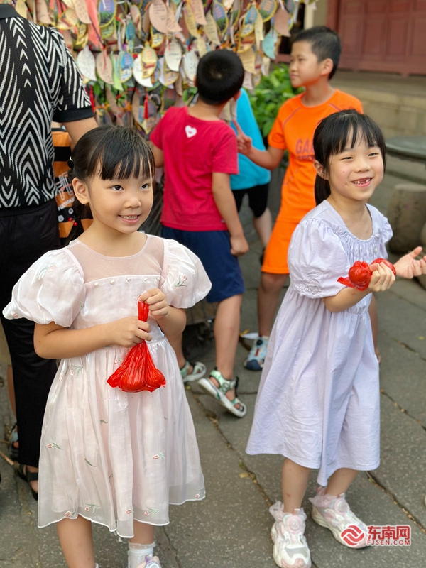 两名即将踏入小学生活的一年级新生拿到红鸡蛋后露出快乐的笑容。东南网记者 林婕 摄