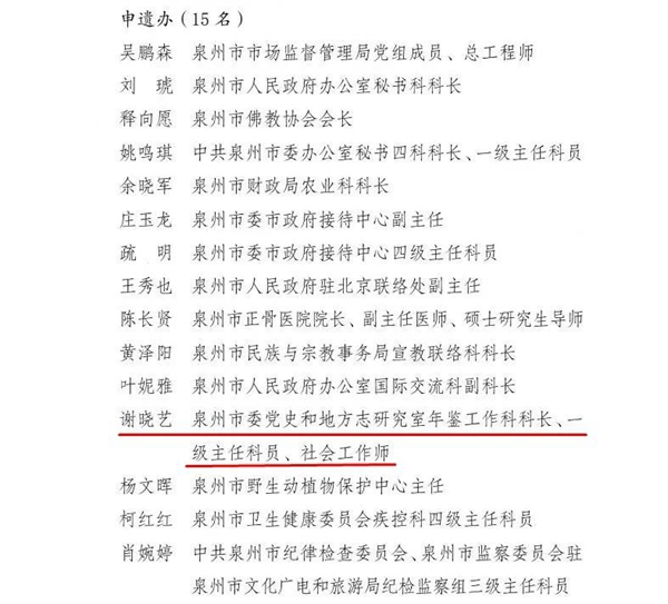 近日,泉州市委、市政府印发《关于表彰“泉州:宋元中国的世界海洋商贸中心”项目申报世界文化遗产先进集体和先进个人的决定》。市委党史和地方志研究室年鉴工作科科长谢晓艺同志被市委、市政府授予“泉州:宋元中国的世界海洋商贸中心”项目申报世界文化遗产先进个人荣誉称号。