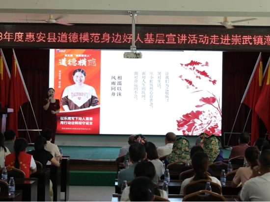 宣讲现场。惠安县委文明办供图 今年9月20日是全国第21个“公民道德宣传日”。为进一步加强公民道德建设,大力倡导公民基本道德规范,弘扬崇德向善的文明风尚,9月20日当天,2023年惠安县“公民道德宣传日”主题活动暨道德模范身边好人基层宣讲活动在崇武镇潮乐村和潮乐实验小学举行。 在潮乐村新时代文明实践站,开展了致敬道德模范·礼赞身边好人——2023年度惠安县道德模范身边好人基层宣讲活动,志愿者向道德模范和身边好人代表们敬献鲜花,表达对模范们诚挚的敬意。道德模范和身边好人代表们与党员干部群众一起观看了视频短片《好人在身边》,聆听了宣讲员们讲述一个个感人肺腑的生动故事,有不离不弃照顾尿毒症丈夫13年的惠安县道德模范庄小虹、行善30多年的泉州市道德模范林闻绿、坚守公路养护一线35年的惠安县道德模范许翠蓉和勇救落水女孩的中国好人、福建好人、惠安县道德模范高威。这些平凡而又不平凡的事迹,深深感染了现场的听众,大家纷纷表示要化感动为力量,以道德模范身边好人为榜样,崇德向善、见贤思齐,从身边小事做起,积极弘扬主旋律,传递正能量。 本次活动由惠安县精神文明建设指导委员会、惠安县新时代文明实践中心主办,中共惠安县委宣传部、中共惠安县委县直机关工作委员会、中共惠安县委文明办、惠安县融媒体中心、惠安县教育局、崇武镇新时代文明实践所协办,崇武镇潮乐村新时代文明实践站、惠安县潮乐实验小学承办。 据悉,接下来,惠安县文明委还将深入企业、学校开展宣讲活动,同时开展线上“云宣讲”活动,为我县干部职工、师生、市民送上一次精神大餐和道德盛宴。 |