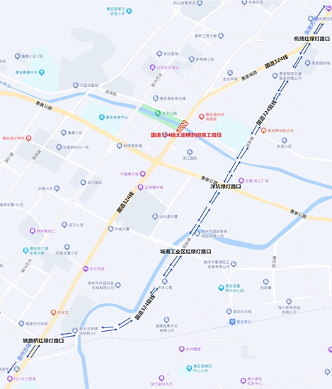 2.沿国道324线泉州往泉港方向途经大溪桥封闭施工路段的车辆,请提前从铁路桥红绿灯路口右转绕行(路线:铁路桥红绿灯路口右转进入国道324复线直行——城南工业区红绿灯路口——洋坑红绿灯路口——机场红绿灯路口——国道324线);沿国道324线泉港往泉州方向途经大溪桥封闭施工路段的车辆,请提前从机场红绿灯路口绕行(路线:机场红绿灯路口左侧直行进入国道324复线——洋坑红绿灯路口——城南工业区红绿灯路口——铁路桥红绿灯路口——国道324线) 图:绕行路线2 (图中红色区域为施工路段限行,图中蓝色箭头为双向绕行路段) |