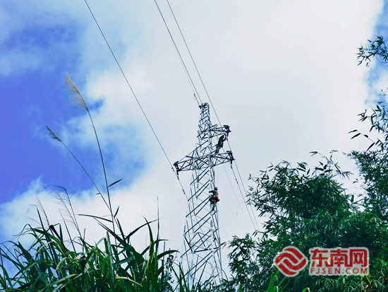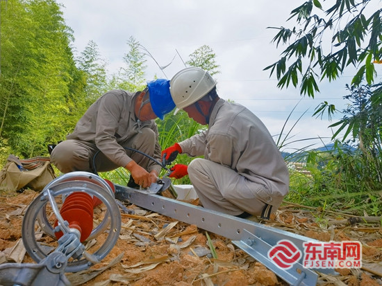 国网永春县供电公司检修人员对35千伏榜仙线32号塔加装线路型避雷器。梁巧玲 摄 |