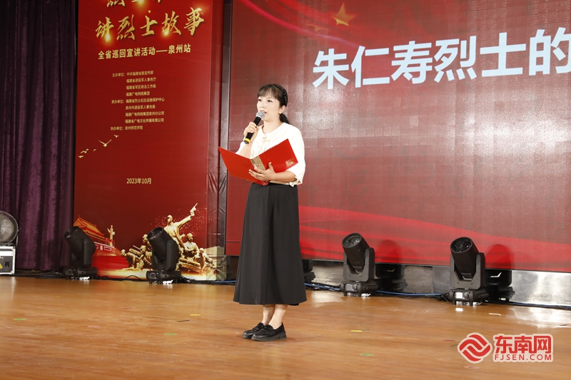 活动现场。东南网记者 陈诗婷 摄 “他,是一名有大爱,有责任,有担当的共产党员。”为了革命,变卖牛磨,购枪支援,远离妻儿,九死未悔,他的家也成为中共泉州中心县委的秘密联络站,但最终却被残忍的敌人活埋,牺牲时年仅43岁。朱晚真带领我们走进了她的曾祖父朱仁寿光辉的革命人生。