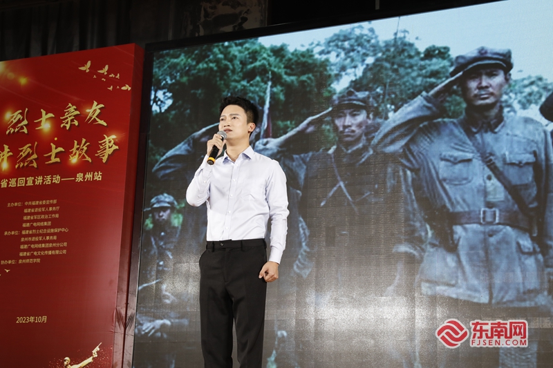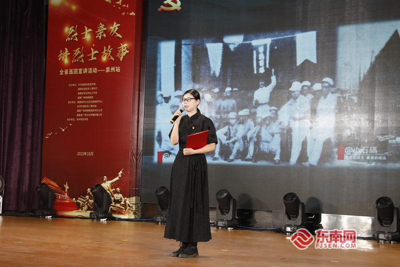 活动现场。东南网记者 陈诗婷 摄 东南网10月20日讯(本网记者 陈诗婷 通讯员 洪景昊 实习生 许娟娟) 昨日下午,全省“烈士亲友讲烈士故事”巡回宣讲泉州站在泉州师范学院举行。 宣讲活动伴随着雄壮的《义勇军进行曲》拉开序幕,6名烈士亲友通过穿越历史时空、超越历史云烟的讲解手法,动情讲述了八闽英烈为民族独立解放、为国家繁荣富强、为百姓守护一方平安作出奉献和牺牲的感人故事。