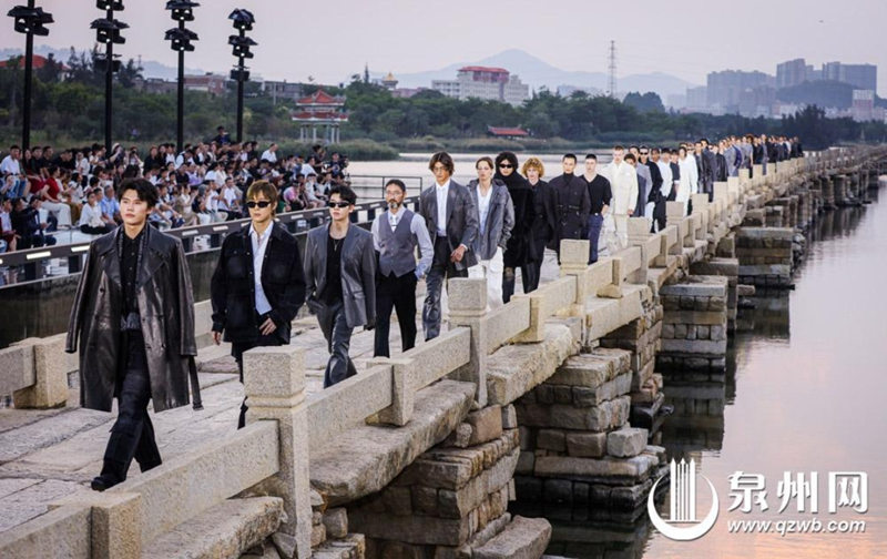 26日,古老的世遗点安平桥化身T型台,暮色中,欧阳靖等知名说唱歌手领衔模特身穿以唐代画家张彦远“五色”理念,结合中国传统美学设计的男装行走在安平桥上。这是泉州鞋服企业以当代走秀形式传承世遗文化的一次创新,凸显国潮泉州的自信和担当。 (许雅玲 黄祖祥 丁志俭 摄) |