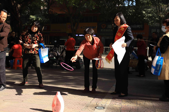 “我就住在对面小区,看到邻居拿了许多奖品回来,我就也过来了。”正在排队等待玩游戏的陈阿姨带着爱人一起来到了活动现场。 “这个要有一点手感,慢一点,一个个套。”百发百中的套圈高手陈爷爷向伙伴分享自己的“通关技巧”。