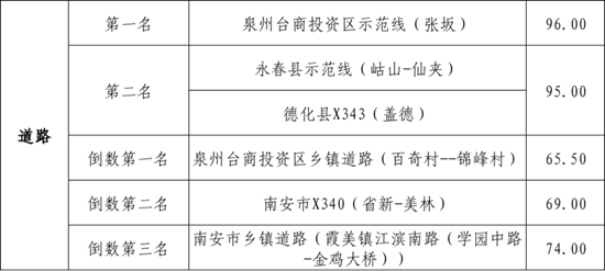 大部分受评的村居总体情况良好,永春县横口乡福中村、泉港区前黄镇凤北村、永春县一都镇黄沙村等村居村容村貌整洁有序,房前屋后保洁到位。但仍有部分村居存在不足,一是部分村居人居环境整治未能常态化开展,日常保洁监管机制仍待完善,未能做到全域保洁;二是村容村貌未能长效化治理,如南安市水头镇大盈村、石狮市灵秀镇港塘村,其中惠安县惠东工业区园区环境卫生差,部分厂区周边垃圾积存,形成卫生死角,已连续两月成绩居全市末位。 道路考评情况
