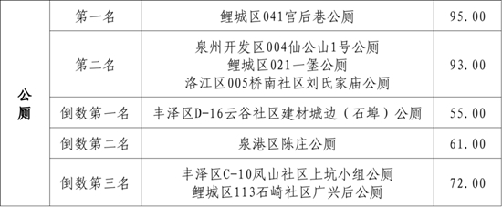 共抽评63个社区,对社区环卫作业、秩序管理等情况开展考评,发现各类问题984处。其中鲤城区开元街道双塔社区、临江街道聚宝社区、隘南社区卫生保洁到位、秩序良好,考评成绩当月前三。个别社区未有效开展薄弱点位清洁作业,路面脏污、积浮土问题多,如丰泽区北峰街道招联社区、鲤城区金龙街道坑头社区、丰泽区北峰街道招丰社区。 公厕项目