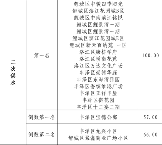 对中心城区34座集贸市场及其周边市容和环境卫生情况开展专项考评,共排查问题484处。其中鲤城区金山市场、丰泽区环山市场、丰泽区圣茂菜市场、丰泽区浦西便民农贸市场秩序良好,保洁到位,考评成绩靠前;部分集贸市场监管力度不足,在精细化管理上仍有所欠缺,常态化保洁机制落实不到位,越摊经营、杂物乱堆放、保洁不到位等问题频发,如鲤城区蔬菜批发市场、鲤城区南菜市场、鲤城区水果批发市场。 二次供水设施管理及水质检测专项考评情况