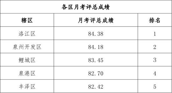 10月份,泉州市考评中心围绕“强产业、兴城市”双轮驱动战略及深化“抓城建提品质”等专项行动,推进创卫创城常态化工作机制,对标城市精细化管理,按照《泉州市市容和环境卫生综合考评工作方案》及其实施细则要求,紧密结合当前中心城区环卫一体化工作,进一步加强中心城区市容和环境卫生管理综合考评,下面看看考评情况: 共发现问题7408处 10月份,共抽评63个社区、82条主次干道、110个住宅小区、26个街旁广场、53条内沟河、6条江岸带、34座农贸市场、84座公厕、55条道路绿化、215个二次供水管理单位、12座公园、3个城建PPP项目,共发现问题7408处。 洛江区荣获第一