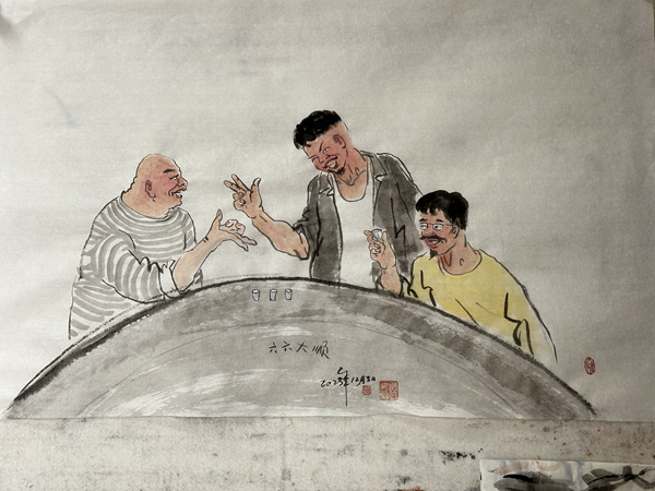 划拳主题画 12月7日,国家级非遗项目泉州木雕传承人、中国工艺美术大师郑国明专门为赛事创作了一幅划拳主题画,并接受海都记者专访,说划拳、聊生活、谈创作,讲述惠安视角下的海洋性格。 划拳是生活润滑剂,更是一种人生态度 “划拳是一项雅俗共享的生活乐事。”在惠安国明雕刻艺术园里,郑国明为记者展示并解释了主题画的内涵。一张大圆桌代表着惠安人的热情,三个人物形象则展示出划拳适合每一个阶层,只要上了桌,就没有“划两拳”解决不了的事。
