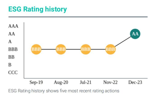 MSCI ESG评级是深受全球投资机构认可的ESG评价体系之一,评级权威度、公信度高,评级结果被国内外投资者广泛应用于投资决策中。公开资料显示,MSCI ESG评级覆盖全球范围内超过16,400家发行人,在年度评级中能够保持往年评级结果的约占60%,能够获得评级提升一级的仅占20%,能够实现评级两级跃升的公司不足1%。