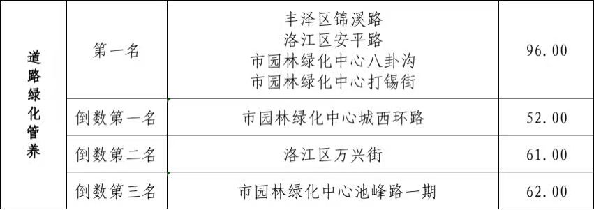 11月份组织对中心城区住宅小区生活饮用水二次供水设施管理及今年第三季度水质检测、水池清洗情况进行专项考评,本期共考评二次供水单位173个、发现问题431处。考评发现多数住宅小区能够定期做好蓄水池的清洗、消毒工作,并按时做好水质检测,水池清洗、水质检测率分别为87.28%、90.17%,相较上一期有所提升;水泵房设施日常管理、维护工作落实到位,存在问题较少。但部分二次供水单位未能定期做好蓄水池的清洗、消毒工作及水质检测,公示位置不合理或未公示;管理人员相关业务不熟,“四害”防制、杂物管理不到位等问题仍较多。 道路绿化管养专项考评情况