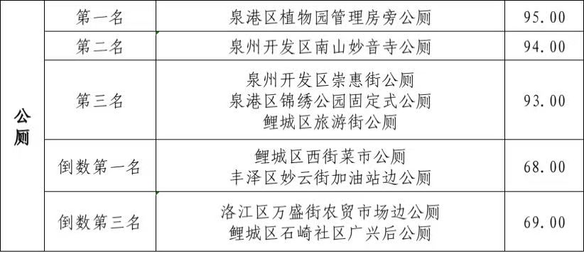 11月份考评中心共抽评69个社区,对社区环卫作业、秩序管理等情况开展考评,发现各类问题1087处。前面三名都是鲤城区,分别是临江街道跃进社区和海滨街道海清社区、涂门社区卫生保洁到位、秩序良好。但个别社区仍存在卫生死角、保洁不到位等问题,丰泽区城东街道庄任社区、泉州开发区第一片区、鲤城区常泰街道华星社区考评成绩不理想,未有效开展薄弱点位清洁作业,路面脏污、积浮土问题多,市容管理秩序亟需提高。 公厕项目