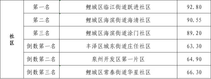 为落实“深学争优、敢为争先、实干争效”行动部署,围绕“强产业、兴城市”双轮驱动战略及深化“抓城建提品质”等专项行动,推进创卫创城常态化工作机制落实,对标城市精细化管理,11月,泉州市城市管理综合考评中心按照《泉州市市容和环境卫生综合考评工作方案》及其实施细则要求,紧密结合当前中心城区环卫一体化工作,进一步加强中心城区市容和环境卫生管理综合考评,下面看看考评情况: 共发现问题7684处 11月份,共抽评69个社区、84条主次干道、114个住宅小区、26个街旁广场、60条内沟河、6条江岸带、33座市场、88座公厕、59条道路绿化、173个二次供水单位、12座公园,共发现问题7684处。 泉港区荣获第一