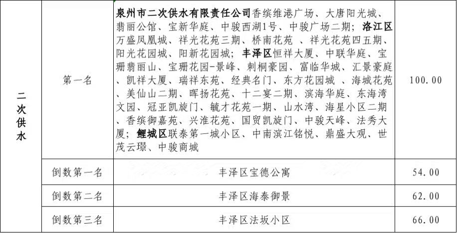 11月份,市创卫办组织市考评中心对中心城区33座农贸市场及其周边市容和环境卫生情况开展分类专项考评,共排查问题528处。其中丰泽区环山市场、圣茂菜市场、浦西便民农贸市场内及周边整洁有序,保洁到位,考评成绩靠前。部分市场责任区地面黏滑、脏污,熟食摊“三防”“三戴”落实不到位,过道和摊位前乱堆放、越摊经营等;市场责任区周边保洁不到位、杂物乱堆放、地面脏污,个别区域存在环境卫生差、设施污损和废弃物未清理等,如鲤城区南菜市场、蔬菜批发市场、水果批发市场考评成绩靠后。 二次供水设施管理及水质检测专项考评情况