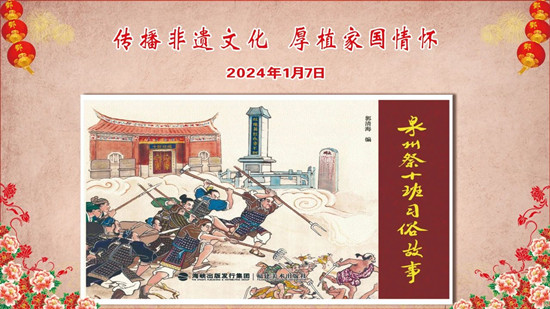 《泉州祭十班习俗故事》连环画视频解说版 这份连环画不仅是对先祖的缅怀,更是对家乡的热爱与守护,它承载着传承非遗文化的使命,为后人留下一份宝贵的精神财富。希望通过连环画这一形式,让更多的人了解十班英烈抗倭的故事。 本连环画由本邑学者刘育钢教授改编自他与“泉州祭十班习俗”传承人郭清海合著的《泉州祭十班习俗故事》,由农民画家陈木春绘图。 此项工作得到有关部门的大力支持。经过泉州市洛江区文化体育和旅游局推荐,福建省财政厅拨款资助,郭清海先生协调各方,此连环画项目终得以落实。 |