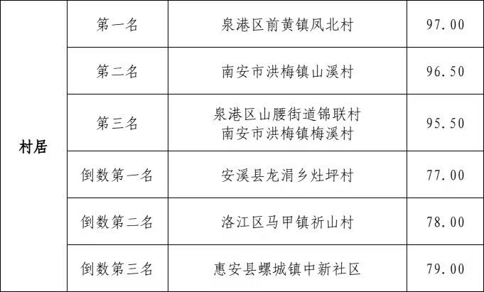 各地持续推动环境卫生、村容村貌综合治理,积极总结探索好经验好举措好机制,提高管理标准,总体情况向好。其中泉港区补齐短板,认真总结和梳理辖区内的环卫保洁薄弱区域及环境卫生整治工作中的短板难题,不断完善制度化建设,成效明显,本月成绩居首。永春县推出系列扎实举措,县镇村共同建立长效巡查机制,提升乡镇对环境卫生的重视程度,改善人居环境,常态化治理市容卫生,成绩较好。台商投资区齐抓共管,镇村齐力,切实推动环境综合整治工作常态化,将环境卫生工作落到实处、细处,着力打造整洁优美的人居环境。但个别县(市、区)、乡镇问题不少,其中洛江区环境卫生问题较多,房前屋后、村主干道、街旁空地等巡回保洁力度不够,整体村容村貌未见明显改观。惠安县人居环境治理存在盲区,商业街与农贸市场周边管理薄弱,地面脏污、杂物乱堆放和污水横流等多类问题并存,本月成绩下滑明显。 村居考评情况