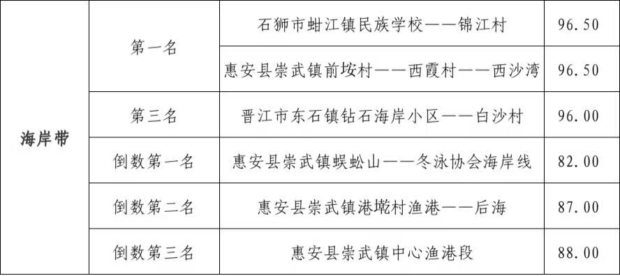 洛江区示范线(河市)、泉港区乡镇道路(凤北凤南凤山坝头—龙田)、泉州台商投资区示范线(张坂)等受评路段日常保洁管理到位、路面整洁有序,考评成绩靠前。部分道路存在主要问题为:一是巡回保洁不及时、不到位,废弃物未清理问题多,整体感观欠佳;二是市容市貌整治不够深入,垃圾收集桶周边地面脏污、日常管理力度仍待提高,如德化县乡镇道路(海露汽车美容中心—福坪路—文昌路—瓷海路-龙津路-龙湖街-纵十二路-丁墘街)、洛江区乡镇道路(八峰路—东方村)、石狮市乡镇道路(锦尚镇港东村—谢厝村—深埕村—厝上村—锦尚村)。 海岸带考评情况