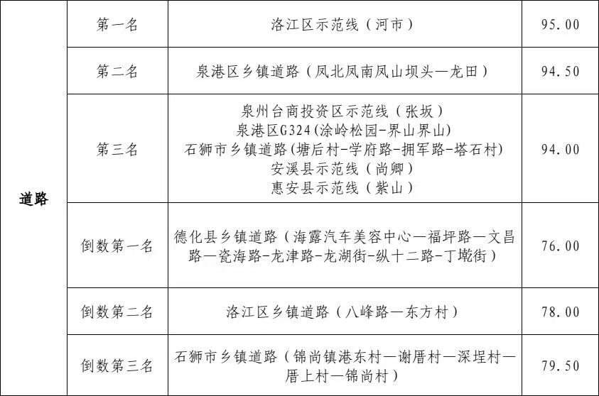大部分受评的村居总体情况良好,泉港区前黄镇凤北村和山腰街道锦联村、南安市洪梅镇山溪村和梅溪村等村居村容村貌整洁有序,房前屋后保洁到位。主要不足有:一是部分村居人居环境整治存在盲区,日常保洁监管机制仍待完善;二是村容村貌未能长效化治理,主要是垃圾收集桶及其周边路面脏污等问题整治效果差,如安溪县龙涓乡灶坪村、洛江区马甲镇祈山村、惠安县螺城镇中新社区当月考评成绩不理想。 道路考评情况