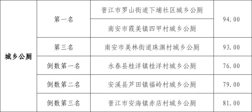 石狮市蚶江镇民族学校-锦江村段、惠安县崇武镇前垵村——西霞村——西沙湾、晋江市东石镇钻石海岸小区-白沙村段等市容秩序良好,环境卫生整洁。但惠安县崇武镇蜈蚣山——冬泳协会海岸线、港墘村渔港——后海和中心渔港段海岸垃圾清运力度较弱,多处环境卫生差及卫生死角,露天垃圾围未能规范整治,整体感观差,成绩倒数。 农村公厕考评情况