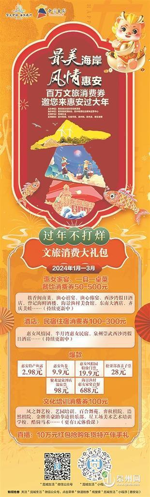 惠安高甲戏《饮水思源》登上国家公共文化云和央视频隆重推出的《我的宝藏“村晚”》特别节目网络直播第一期。 这一年,文艺创作精彩纷呈。颜色辉、许小奇、林丹雅等三人摘得福建省戏剧水仙花奖,创排高甲新戏《岳家小将》、惠女民俗舞蹈《惠女婚嫁情》,复排精品惠女舞蹈《我是惠女兵》获第十五届福建音乐舞蹈节泉州赛区选拔赛三等奖,舞蹈《佤山火》获第三届福建省街头文化艺术展演泉州地区选拔赛铜奖。 以赛促旅、以旅带文、文体旅相融,惠安也构建新业态,实现与体育的“双向奔赴”,提升群众的身体素质与生活质量—— 全民健身体系提优,新建5个口袋健身公园、13条全民健身路径、3个多功能运动场及2个足球场,创建省级全民运动健身模范县顺利通过省初评。 竞技体育再创新高,承办第十二届市运会赛事项目4个,是全市承办赛事项目最多的2个县(市、区)之一,获64金、63银、75.2铜、总分2916.5分,总分榜排名居全市第三位、总金牌榜居第五位,为惠安历史以来最好成绩。 办赛能力升级,引入大型赛事,成功承办海丝侨界青年人才嘉年华暨龙舟赛系列活动、省跆拳道俱乐部online联赛、市广场舞锦标赛、省体育舞蹈公开系列赛(泉州站)等跨区域体育赛事,吸引各地参赛选手4000余人。 做热乡村体育,推出“体育+山线乡村振兴”旅游线路,举办“一县两区”划拳争霸邀请展演、首届和美乡村篮球赛、惠安“村BA”首个周末全明星赛,全年举办体育舞蹈、乒乓球、篮球、围棋等各门类体育赛事上百场次,掀起了全民体育运动热潮。 一分耕耘一分收获。2023年,惠安获福建省文旅厅文旅品牌强县正向激励三等奖,在全省9个、全市2个获奖励的县(市、区)“文旅优等生”阵营中占据一席之地。 年庆、年游、年味、年话、年礼、年景 春节元宵“大过惠安年”! 2024年春节、元宵期间,惠安将以“大过惠安年”为主线,围绕“年庆、年游、年味、年话、年礼、年景”六个主题,聚合县、镇、村三级文化力量和全县旅游要素供应链,推出文旅节庆和旅游产品,欢迎大家来惠过年、在惠过年。 聚享年庆,一镇一主题、村村有活动,特别是将突出古城内外联动,举办“火红中国 探春古城”文化节,推出“话仙崇武”系列活动,依托古大厝和古街道精心布点茶馆故事汇、甲胄巡城、投壶射箭军事文化体验,并可体验惠安女服饰、龙年主题非遗课程,让市民游客感受到明代海防古城的魅力和浓厚的年俗文化气息。 畅快年游,积极推出多元文旅线路,在惠安文旅微信公众号开辟“好惠玩”专题,多渠道发布“十个最美打卡点”“新春到惠安研学啦!”系列主题旅游体验线路,配套推出小而精的休闲游憩文旅产品和线路。 共品年味,以一场惠安女网红主题直播、一桌惠安年夜饭、一条美食风味街区等方式多线推介本地风味美食,并结合农产品展销、非遗文化旅游活动、消费节等主题活动以及乡贤返乡、民俗家宴等,在全县各镇域以及主要景区(点),传承展示地方特色佳肴。 热议年话,全面铺开主题宣传推广,吸引大家热烈参与。 普发年礼,定制专属文旅消费礼包,预计发放消费券250万元,其中政府补贴50万元。 丰盈年景,在主要交通节点、崇武古城等重点景区以及全县星级酒店等,布设具有龙年新春和惠安地域特色的打卡场景,营造全域全境过大年氛围,让惠女、古城和龙年主题元素扮靓大家的新春佳节。