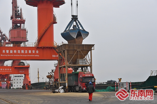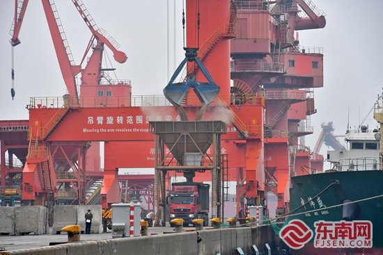 在泉港区肖厝港码头3号泊位,成吨的小麦从散装轮上卸下装车运走。洪坤泽 摄 |