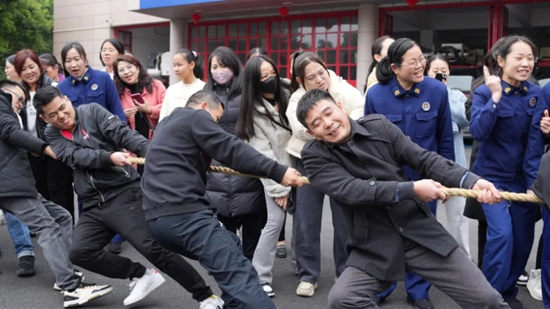 本次职工趣味比赛共设置拔河比赛、击鼓颠球、翻滚吧,易拉罐等3个集趣味、竞技于一体的比赛项目。 随着比赛口令响起,拔河选手们咬紧牙根,使尽全力!比赛现场瞬间淹没在震耳欲聋的呐喊声中。双方队员紧紧抓牢手中的麻绳,降低重心,齐心协力往后“拔”。比赛双方你争我夺、互不相让,每个队伍都斗志昂扬,力聚一股绳,劲往一处使。地方政府单位小朋友们还与消防救援队伍小朋友及地方政府女同志与消防救援大队女同志分别组队进行pk赛。拔河比赛的第一名是青阳消防救援站,第二名是龙湖消防救援站,第三名是陈村消防救援站。 击鼓颠球是一项集团队凝聚力、专注力、协作力及沟通能力于一体的趣味活动。随着裁判人员哨声一响,参赛人员牵起他们手中的鼓绳。这紧紧牵起的不仅是鼓绳,更是他们每个人团结一致,争分夺秒、勇于拼搏的心。陈埭消防救援站以颠球232下,拿下第一名!第二名是龙湖消防救援站,第三名则是青阳消防救援站。
