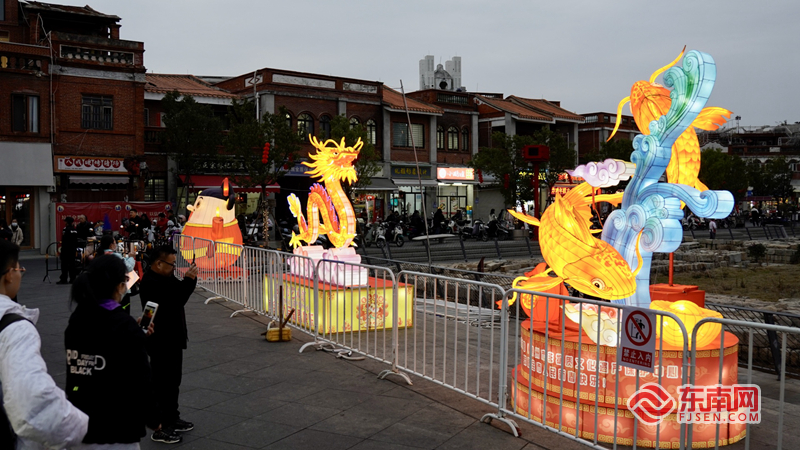 金鱼巷巷口展出大型国潮龙灯—— “龙鲤鲤大青龙”和花灯相得益彰。东南网记者 林婕 摄 东南网2月23日讯(本网记者 林婕 实习生 林梦琳)今天是正月十四,也是2024年泉州元宵灯会正式亮灯第二天,夜幕降临,华灯初上,花灯展区继续迎来众多市民游客,人们携家带口,古城街头巷尾游人如织,空气中弥漫着浓浓的节日气氛。