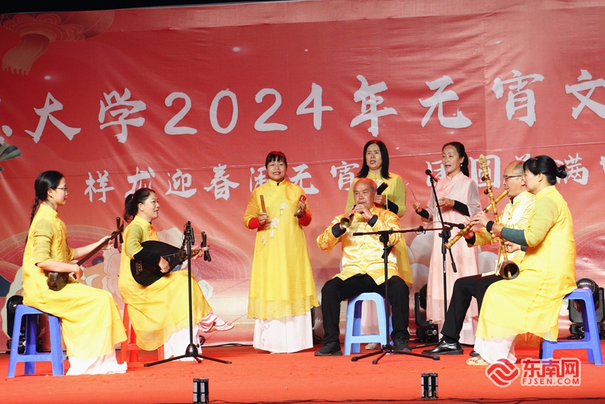 师生观看南音表演。杨雅桐 摄 两根竹竿架火鼎,亦庄亦谐妙趣生,或快步飞穿,或缓缓踟蹰,火鼎公婆夸张的扮相、诙谐的表情、灵动的舞姿引得师生纷纷驻足观看,拍手叫好;拍胸舞者赤裸上身及双足,舞步粗犷威武,不舞则已,舞则淋漓尽致,直至拍得遍体通红,近乎野性宣泄式的舞风赢得师生阵阵掌声;一线串成天下事,双手拨动古今人,表演者运用手上功夫操纵木偶、塑造一个个活灵活现的舞台艺术形象,师生近距离观赏泉州提线木偶戏,感受艺术家精湛的“指尖功夫”……整场文体联演内容丰富、形式多样,不仅有独具特色的民间艺术,还融入新潮时尚的国潮元素,让师生沉浸在文化的饕餮盛宴。 |