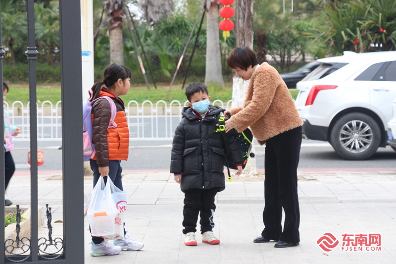 低年级小朋友在家长的帮助下,背上书包,准备踏入校园。东南网记者 黄雨昕 摄