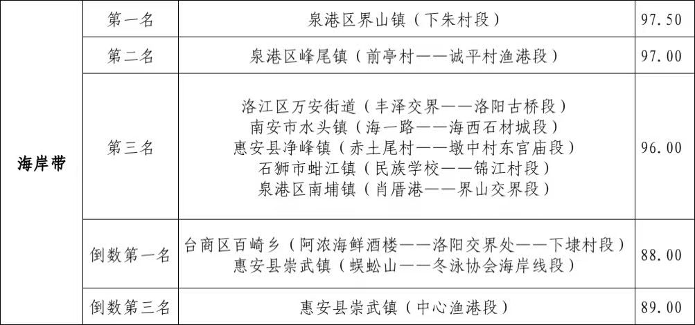 德化县乡镇道路(三班)、晋江市G228(金井-英林)、泉港区示范线(涂岭)等受评路段日常保洁管理到位、路面整洁有序,考评成绩靠前。部分道路存在主要问题为:一是巡回保洁不及时、不到位,废弃物未清理问题多,整体感观欠佳;二是市容市貌整治不够深入,垃圾收集桶周边地面脏污、“牛皮癣”未清理等问题,如南安市乡镇道路(水头)、南安市X340(省新-美林)、安溪县G355(魁斗-凤城-城厢段)市容秩序管理力度薄弱,路面浮土未清理,观感差,考评成绩靠后,长效机制待形成。 海岸带考评情况