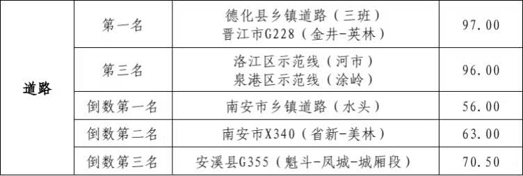大部分受评的村居总体情况良好,德化县葛坑镇水门村、三班镇蔡径村,南安市翔云镇云山村等村居村容村貌整洁有序,房前屋后保洁到位,当月成绩靠前。但部分村居仍存在不足:一是部分村居人居环境整治存在盲区,日常保洁监管机制仍待完善,未能做到全域保洁,房前屋后垃圾、废弃物清理不及时。二是村容村貌未能长效化治理,主要是垃圾收集桶及其周边路面脏污、“牛皮癣”未清理、家禽未圈养等问题整治效果差,“回潮”快,如泉港区后龙镇坑仔底村、南安市美林街道李西村、晋江市东石镇许西坑村等村居环境卫生管理不到位,村庄边沿空地管理失位,垃圾堆积多,当月成绩不理想。 道路考评情况