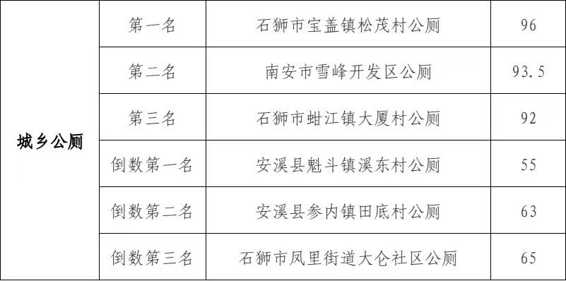 石狮市宝盖镇松茂村公厕、南安市雪峰开发区公厕、石狮市蚶江镇大厦村公厕管理较好,厕容整洁。但部分公厕组织管理及精细化管理仍需提高,安溪县魁斗镇溪东村公厕、参内镇田底村公厕和石狮市凤里街道大仑社区公厕责任人、监督电话、公厕管理制度等未上墙,厕内环境卫生极差且异味严重等问题并存,当月成绩靠后。 |