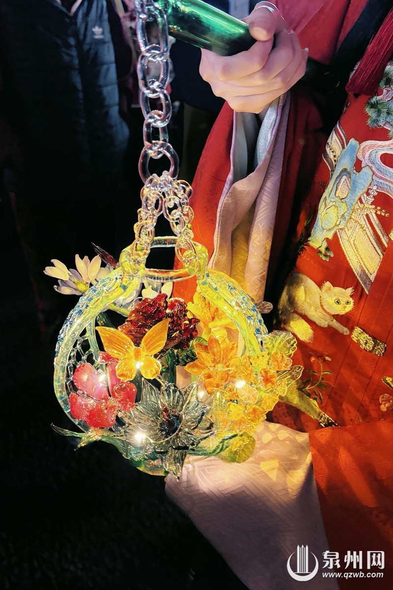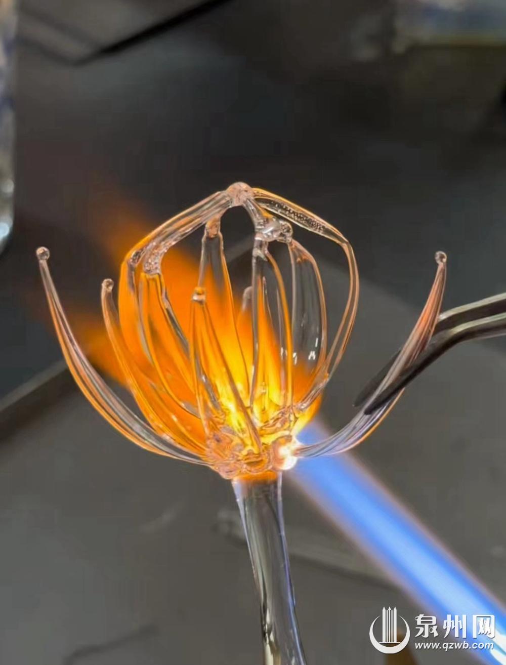 毕业作品:玻璃金纸 巧思于行 用玻璃制作花灯和金纸 1996年出生的陈墨是泉州市区人,2019年从天津美术学院玻璃艺术专业毕业。以自己的专业结合家乡传统文化进行创作,一直是她努力的方向。她的毕业设计作品就是玻璃粉烧工艺制作的泉州传统金纸。当时她以“倒叙的粉末”为主题进行创作,薄如蝉翼的“金纸”一张张悬挂在空中,随风飘动,很是逼真。她介绍,烧金纸是从纸张到粉末的过程,而她的这个作品则是将玻璃粉末烧制成薄片,再变成一张张“金纸”。事实上,每一件作品,她都会在玻璃工艺、综合材料和传统文化之间寻找共同点进行创作,并在创作过程中不断改进调整。 “蟳埔女日常的劳作其实是很辛苦的,她们用美丽的传统服饰装扮自己,鼓励自己,是对美好生活的一种憧憬。”陈墨说,玻璃在高温中“浴火重生”,就像蟳埔女坚韧不拔的精神、活出精彩的姿态。这也是她的作品最想传达和推广的。除了金纸、玻璃簪花围,她还创作了花灯、香炉等极具泉州特色的玻璃作品。