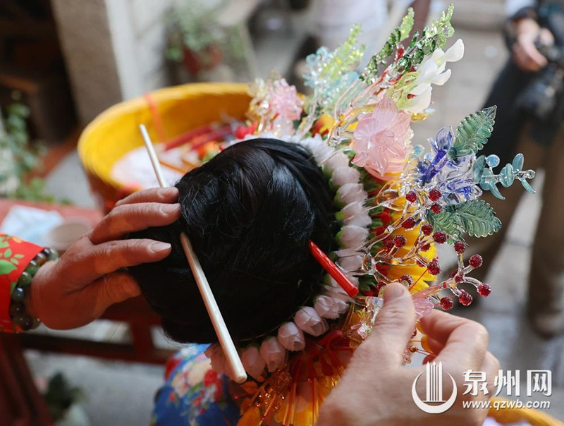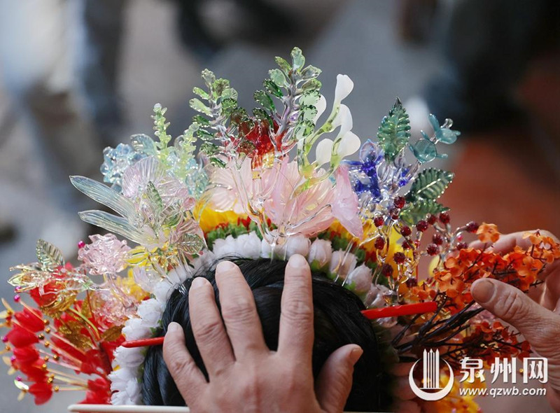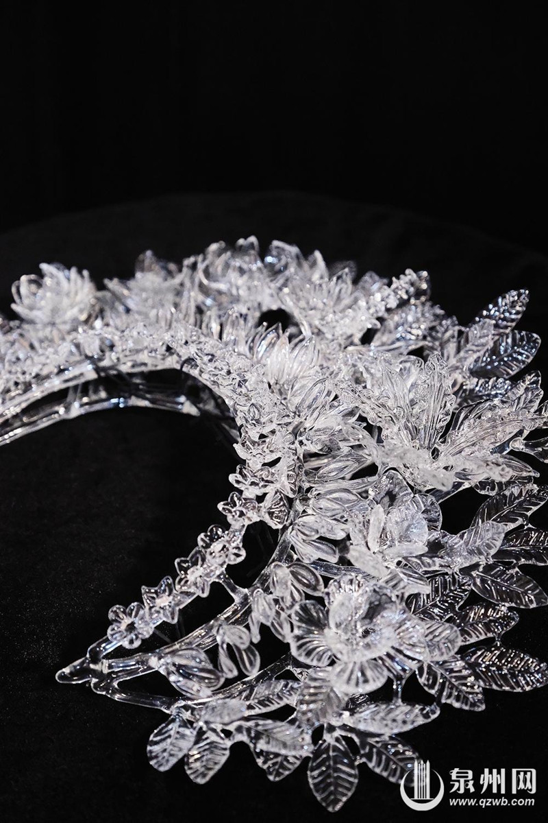 创意的玻璃簪花和阿嬷的传统簪花来一场交流碰撞 重约2斤 近百朵玻璃花拼接而成 “去年12月开始做,做了一个多月才完成。”在丰泽蟳埔社区,陈墨一身蟳埔女装扮,一边等待着蟳埔阿姨帮忙簪花,一边向记者介绍。通过焚烧工艺,她用透明玻璃制出300多片花、叶,再做成大大小小、形态各异的近百朵玻璃花,有茉莉、玉兰、月季、山茶、菊花、夜来香等形状,最后拼接成一顶透明的玻璃簪花围。完成后的作品像极了冰雕,于是她干脆将它带到东北,来一次“文化大碰撞”。 在吉林延边朝鲜族自治州,陈墨身着朝鲜民族服饰,头戴玻璃簪花围出镜;在黑龙江哈尔滨,她那东北大花袄配玻璃簪花围的装扮引来满满的回头率。“很多人的围观,他们并不知道什么是簪花围,趁这个机会,我可以好好宣传一下家乡。” “简直是一顶低头会掉的王冠!”玻璃簪花围的视频一经发布,便引起网友一片惊叹,大家赞叹之余,最关注的是“它有多重”。陈墨揭秘,整顶约2斤重,佩戴时需要寻找角度,出门一路都要小心翼翼的。