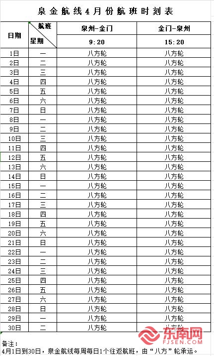东南网3月11日讯(本网记者 谢玉妹 通讯员 林燕)记者从泉州市交通运输局获悉,为进一步满足两岸旅客的出行需求,4月1日起,交发集团权属泉州市海上客运有限责任公司将实行每周7个往返泉州金门的航班,做到每日一班。 该航班全部由“八方”轮执行,从石井港至金门往返航程大约60分钟。航班时刻为每日上午9时20分从泉州出发至金门,15时20分由金门出发至泉州。 作为大陆对台第三条“小三通”客运航线,泉金航线将两岸从“咫尺天涯”变成“天涯咫尺”,是两岸经贸文化交流和人员往来的重要桥梁和纽带。从2006年泉金航线破浪而出、翻开第一页开始,这条特殊的航线成功实现了安全运营零事故,见证了两岸经济融合发展的变化,成为连接两岸亲情的暖心航线。 截至目前,航线可搭乘人员为台胞、台配、陆生、港澳籍、外籍以及持探亲(含长期探亲)出入台许可证的陆籍人士。据了解,在石井即可办理落地签,此外,泉金客运码头实行全天候免费停车。