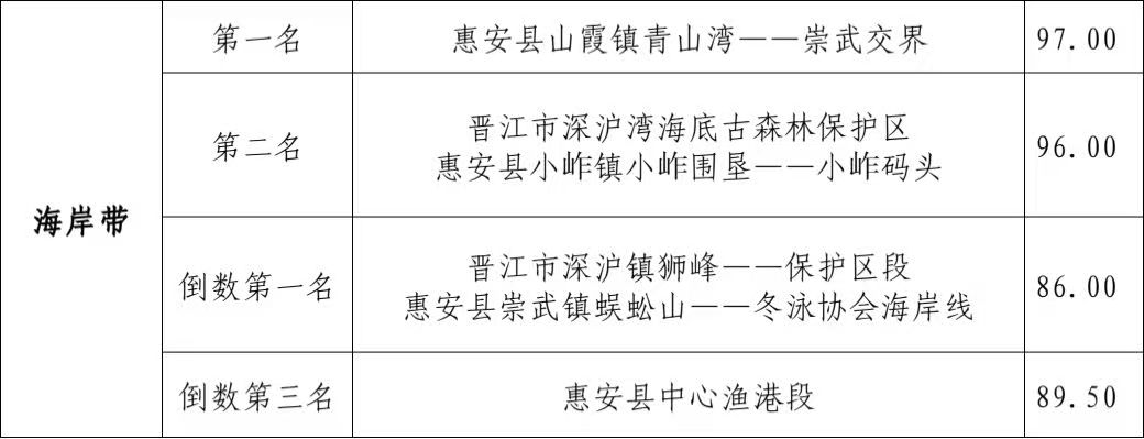 泉港区示范线(涂岭)、乡镇道路(前黄)、惠安县乡镇道路(辋川)、德化县乡镇道路(南埕)、南安市示范线(蓬华)等受评路段日常保洁管理到位、路面整洁有序,考评成绩在90分以上。部分道路受评情况不理想,一是巡回保洁不及时、不到位,废弃物未清理问题多,整体感观欠佳;二是市容市貌整治不够深入,垃圾收集桶周边地面脏污、广告幅及店招破损等问题,如石狮市示范线(永宁)、安溪县G358(城厢-官桥-虎邱段)、永春县乡镇道路(石鼓)等巡回保洁力度不足,观感较差,成绩靠后。 海岸带考评情况