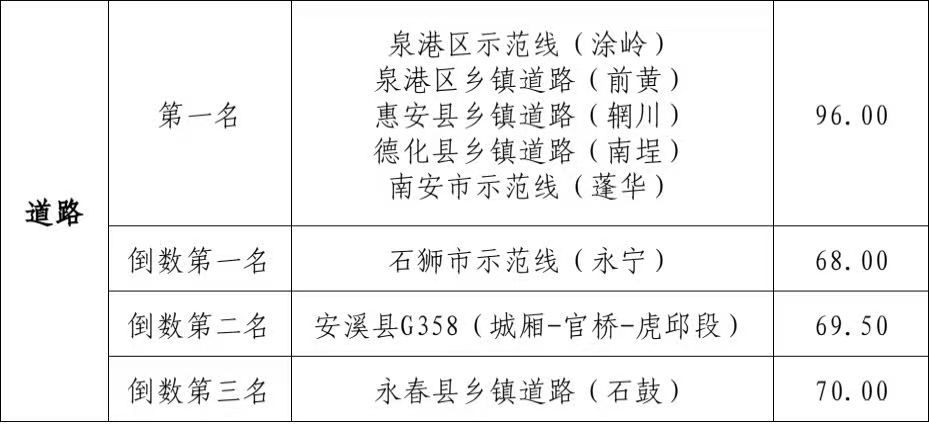 大部分受评的村居总体情况良好,泉港区前黄镇后张村、前烧村、涂岭镇黄田村、南安市蓬华镇山城村等村居总体村容村貌整洁有序,房前屋后保洁到位,当月考评成绩前三。部分村居主要存在不足有:一是部分村居人居环境整治存在盲区,日常保洁监管机制仍待完善,未能做到全域保洁;二是村容村貌长效化治理工作不扎实,主要是垃圾收集桶及其周边路面脏污、“牛皮癣”未清理、家禽未圈养等问题整治效果不理想,“回潮”快,如安溪县白濑乡下镇村、永春县玉斗镇凤溪村、石狮市灵秀镇华山村等村居当月考评成绩不理想。 道路考评情况