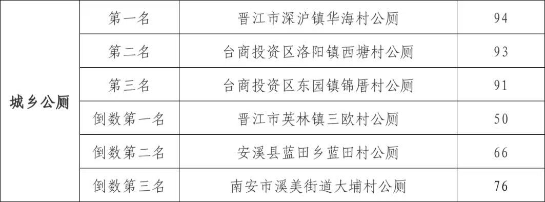 晋江市深沪镇华海村公厕、台商区洛阳镇西塘村公厕和东园镇锦厝村公厕等管理较好,厕容整洁,厕容整洁。但部分公厕组织管理及精细化管理仍需提高,晋江市英林镇三欧村公厕疏于管理,废纸篓满溢,照明设施无法正常使用且残疾人间未开放,成绩仅50分;安溪县蓝田乡蓝田村公厕、南安市溪美街道大埔村公厕、晋江市永和镇割山村公厕存在墙体破损、门锁缺失损坏、杂物堆放在厕内等问题,当月考评成绩不理想。 |
