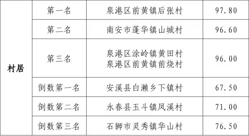 各地持续强化责任落实,多举措推动环境卫生、村容村貌综合治理,进一步完善健全工作机制,扎实推进城乡人居环境管理,营造卫生整洁、文明有序、健康祥和的节日环境。泉州台商投资区聚焦难点,紧盯重点,多次开展春节前后人居环境专项整治工作,着力打造整洁优美的人居环境,营造整洁和谐的节日氛围,当月成绩居首。德化县结合春节专项环境整治行动,由点及面,共同发力,全域整治提升,成绩较好。泉港区全面统筹协调,加大清扫保洁和垃圾收运处置力度,全力打造干净整洁的环境。个别县(市、区)、乡镇整治工作开展情况不理想,其中安溪县多个乡镇统筹调度不到位,房前屋后、河沟、空地上卫生死角未及时清理,多条道路巡回保洁不到位,考评成绩不理想。晋江市房前屋后、村主干道、闲置空地等巡回保洁力度不够,市容秩序管理不到位,杂物乱堆放、废弃物未及时清理等现象依旧较多,本月成绩不理想。 村居考评情况