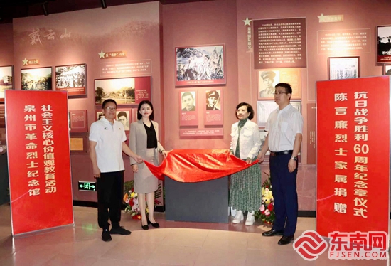 捐赠仪式。东南网记者 陈诗婷 摄 东南网4月6日讯(本网记者 陈诗婷 实习生 陈梓琳)“父亲的遗物在我们手里是珍藏,可捐赠出来,却可以让更多的人知道他的英雄故事,传承红色家风,弘扬革命精神,我认为很值得!”4月4日,一场简朴而庄重的捐赠仪式在泉州市革命烈士陵园举行,陈言廉烈士的女儿陈奕平在家人的陪同下,将珍藏多年的抗日战争胜利60周年纪念章无偿捐赠给泉州市革命烈士陵园。自此,这枚象征着革命先烈荣光的纪念章将被陈列在烈士纪念馆内。 泉州市委党史和地方志研究室、丰泽区委文明办、泉州市革命烈士陵园保护中心等相关人员,以及陈言廉烈士的家属们共同参加了捐赠仪式。仪式开始前,与会人员共同追忆陈言廉烈士的英勇事迹。随后,泉州市革命烈士陵园保护中心负责人向烈士家属宣读感谢信,并颁发捐赠证书。 抗战时期,陈言廉为抵抗日寇挺身而出,参与收复南日岛、攻打福清城、夜袭金门岛等战斗。后在进步思想的影响下,陈言廉于1949年毅然率900多人在晋江安海起义,并率部解放永安、大田、明溪等县,参加了清剿南安、永安、德化和闽西南国民党残匪的战斗,战绩显赫,为福建的解放作出了积极贡献。1950年5月,陈言廉赴华东军区学习,结业后留军区教导团工作。1951年8月不幸逝世,时年42岁。1984年陈言廉被追认为革命烈士。 |