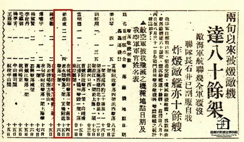 1937年9月8日《中央日报》关于中国空军战绩的报道 “华侨之鹰”,壮烈牺牲 但是,“一代战神”梁添成,也在这个时期消失在了夜空。 1939年6月11日,日军27架轰炸机从汉口起飞,趁暮色昏暗,意欲偷袭重庆。彼时,梁添成所在的中国空军第4大队奉命升空拦截。 梁添成驾驶编号为2307号的E-15战斗机,采取“吊着敌机尾巴打”战术,对敌人穷追猛打,后不幸被敌火力击中,坠落于涪陵附近,机毁人亡。