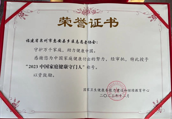 荣誉证书 为进一步促进基层医疗卫生体系健康发展,展示疫情防控、健康中国建设等重要成效,以挖掘选树先进典型展现奋进新时代的新气象,融合推进爱国卫生运动和健康中国行动,国家卫生健康委能力建设和继续教育中心于2023年6月至11月全国开展了2023年度“中国家庭健康守门人”征集活动。最终评选出个人案例90个,团队案例60个。其中,惠安县乡医志愿者协会荣获“2023年度中国家庭健康守门人”团体荣誉称号。 据介绍,惠安县乡医志愿者协会于2018年5月正式成立,是全国首个由乡村医生自发组织,并经民政部门批准注册成立的志愿服务组织。服务队自成立以来,持续为城乡居民、孤寡老人、残疾人、五保户、外来农民工开展免费健康指导、健康体检、送医送药等公益活动,至今共开展免费健康体检21700人次、健康指导27785人次、送医送药近30万元,建立了近6万份义诊对象医疗档案。曾获评过福建省最佳志愿公益服务组织、入围全国100个最佳志愿服务组织先进典型等荣誉称号,2017年12月以服务队先进事迹为原型的微电影《守护》在惠安县开拍并举行首映式。(中国家庭报)