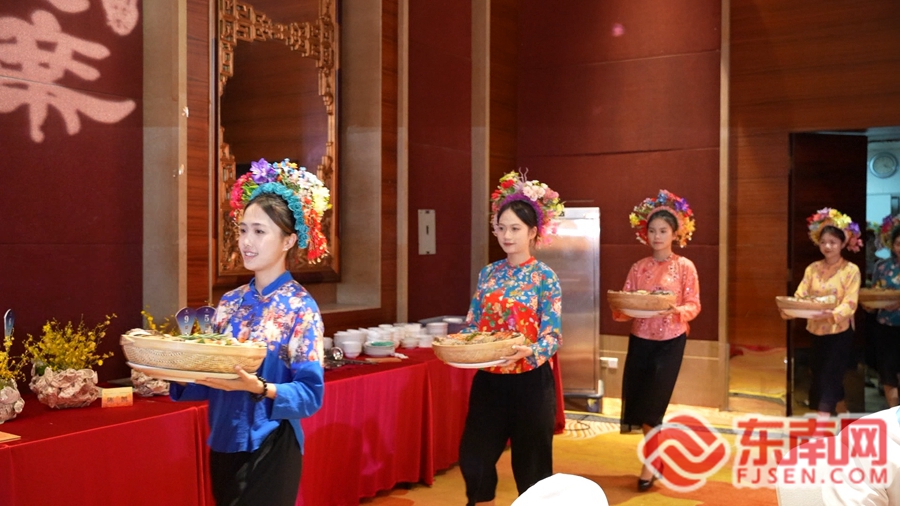 服务人员身着惠安女、蟳埔女服饰呈上泉州特色菜肴。东南网记者 林婕 摄