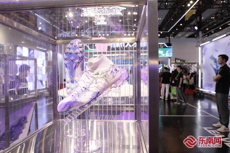 卡尔美展出“薰衣草”系列产品,这是一款专门为足球运动员设计的运动鞋。东南网记者 陈诗婷 摄