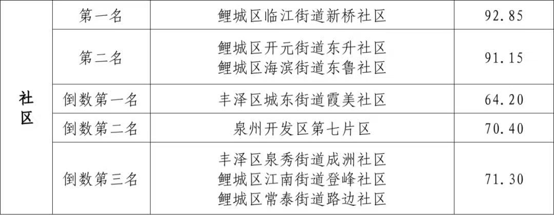 鲤城区临江街道新桥社区、开元街道东升社区、海滨街道东鲁社区等社区卫生保洁到位,秩序良好,考评成绩靠前。但部分社区对历次考评存在问题多的点位、类型、时段未能举一反三加强整治,长效管理机制不完善,市容市貌提升效果不明显,卫生问题“回潮”快,如丰泽区泉秀街道成洲社区、鲤城区江南街道登峰社区和常泰街道路边社区保洁盲区多、提升滞后、精细化作业水平不高、路面脏污问题多,考评成绩垫底。 公厕项目