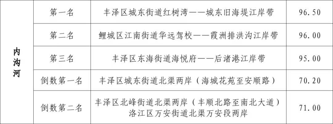鲤城区金山市场、丰泽区圣茂菜市场和环山市场场内及周边整洁有序,保洁到位,考评成绩靠前。但农贸市场在精细化管理上仍有所欠缺,高峰期保洁力量不够,秩序管理不严,存在责任区范围内杂物乱堆放、占道经营等现象普遍,部分市场摊位瓷砖不整洁、猪肉摊未公示当日检验检疫证、水产区未使用规范宰杀台、熟食摊未落实“三防”“三戴”,保洁不理想,车辆入场等,如丰泽区滨城农贸市场和法石市场、鲤城区果疏批发市场,考评成绩垫底。 内沟河项目
