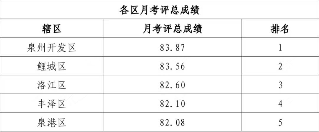 为深化拓展“深学争优、敢为争先、实干争效”行动部署,围绕“强产业、兴城市”双轮驱动战略及深化“抓城建提品质”等专项行动,推进创卫创城常态化工作机制落实,对标城市精细化管理,3月,泉州市城市管理综合考评中心按照《泉州市市容和环境卫生综合考评工作方案》及其实施细则要求,进一步加强中心城区市容和环境卫生管理综合考评,一起看看考评情况: 共发现问题7936处 3月份,共抽评73个社区、91条主次干道、58段内沟河、6条江岸带、110个住宅小区、27座街旁广场、33座集贸市场、285座公厕、60条道路绿化、12座公园、94个二次供水单位,共发现问题7936处。 泉州开发区荣获第一